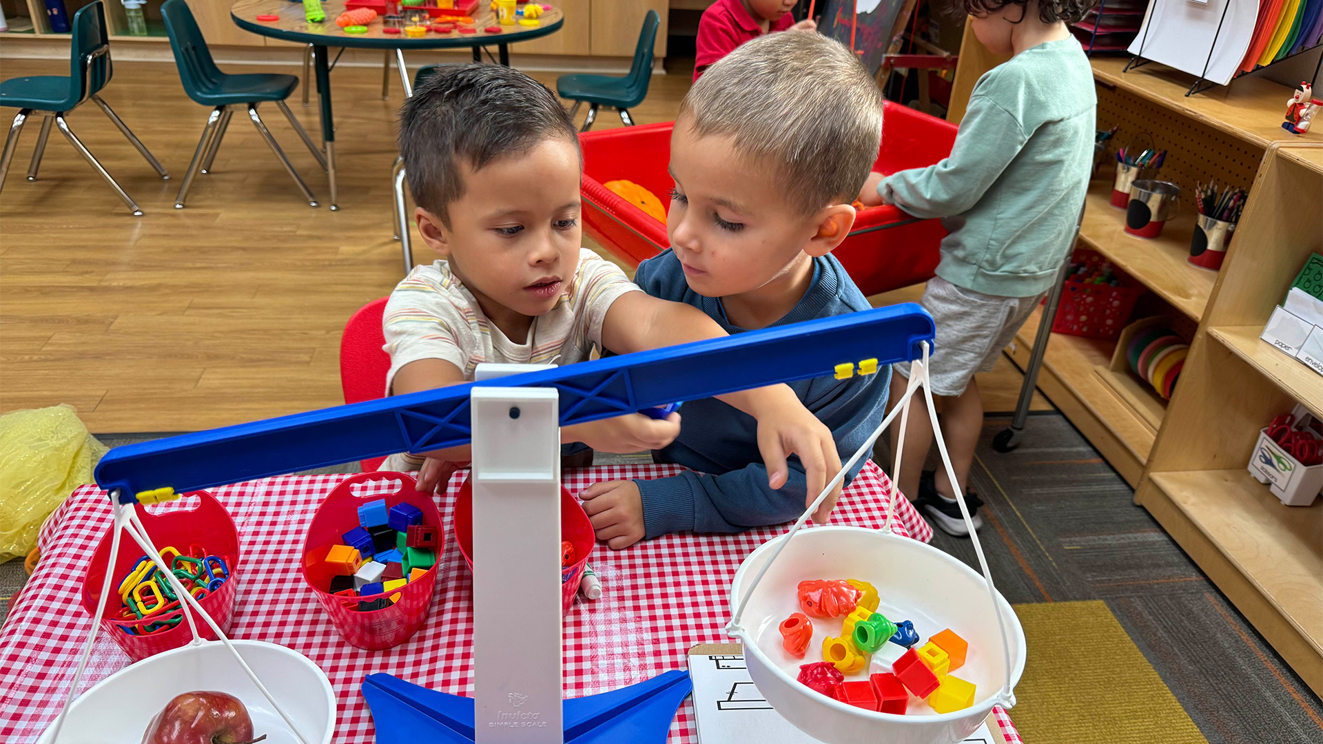 During class, children experience creative free play, story time, snack time, art, learning centers, enrichment (motor skills, music), playground, chapel time, and lunch!